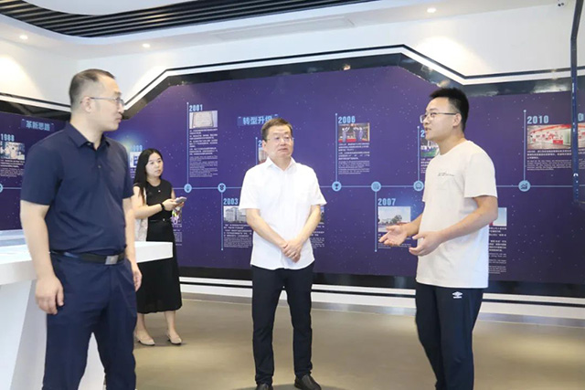 隨后,譚主席一行參觀了宏寶展廳,觀看了企業宣傳視頻,了解了宏寶集團的發展歷程,集團公司黨委書記丁亞龍匯報了集團近幾年的發展情況及勞模創新工作室取得的成績。